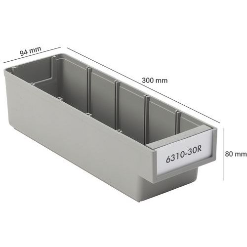Bacs pour étagère. S’intègrent facilement dans les systèmes de rayonnages standard. Trois profondeurs : 300 mm, 400 mm et 500 mm. Existent également en version empilable. Les bacs ont des parois droites. Les étiquettes en carton sont livrées de série. Séparateurs transversaux transparents (polystyrène recyclé).