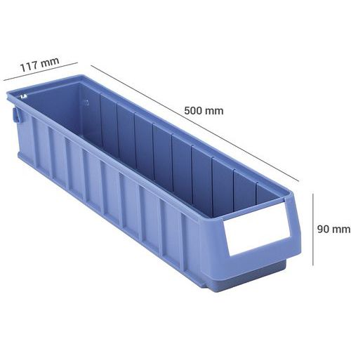 Multiples possibilités de cloisonnement intérieur. Bac-tiroir indéformable résistant aux huiles et graisses. Gerbable avec bacs série RK de même largeur. Charge maxi (kg) : 13 kg