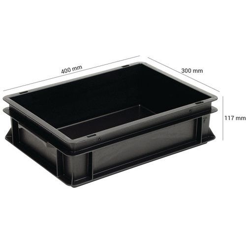 Bacs gerbables Norme Europe en matière conductrice disposant de parois pleines, un fond plein ou compact et deux poignées coquilles ou pleines.