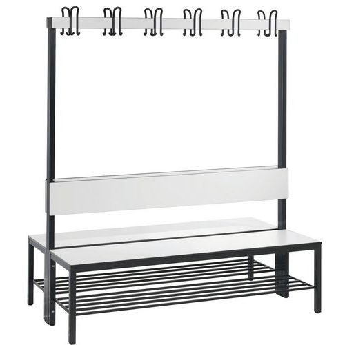 Banc de vestiaire double face avec dossier et patères, de construction solide, avec ou sans grille-chaussures selon modèle. Très belle finition avec revêtement bois massif : assise, dossier et barre à crochets HPL, haute résistance à l'humidité. Barre à crochets avec double crochets à revêtement plastique de protection, pour répondre à la norme DIN 7917. Banc avec patins vérin de sol protecteurs, ajustables pour une compensation parfaite de la hauteur (10 mm). Structure tube d’acier section 30 x 30 mm. Revêtement assise HPL épaisseur 13 mm. Modèle avec grille porte-chaussures : châssis zingué par électrolyse.
