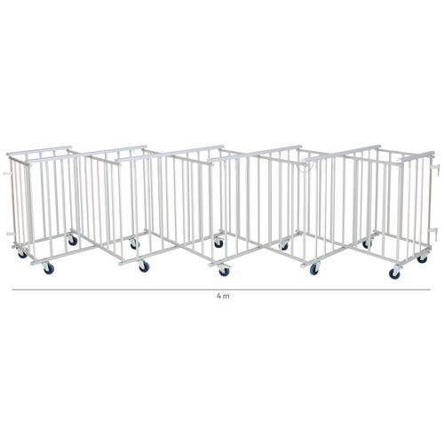 Barrière extensible autoportante et robuste. Supporte de fortes pressions : convient à tout événement qui attire du public (manifestations sportives et culturelles, concerts, salons, stades, parcs d’attraction, …). Simple d’utilisation et de stockage: facile et rapide à mettre en place. Se déplie par roulettes et se stabilise en 5 secondes. Blocage des roulettes : par simple pression sur le frein. Axe et visserie en inox : résiste aux intempéries sans risque de rouille. Les roulettes sont composées de : roues en caoutchouc bleu, de chapes en acier zingué, embouties et pivotantes. Fabriqué en UE