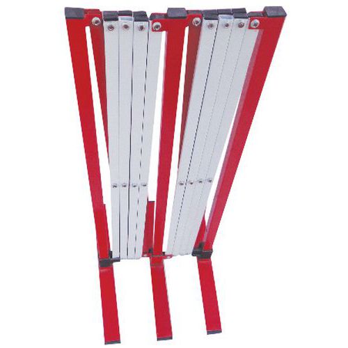 Barrière de chantier extensible à barreaux articulés par rivets. Prend très peu de place une fois pliée. Convient pour un usage intérieur et extérieur.