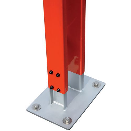 Barrière levante sur platines, avec lisse en aluminium à bandes réfléchissantes rouges. Double serrure pompier et cylindre européen. Système de verrouillage en position ouvert/fermé. Contrepoids intégré. Support de flèche sécurisant pouvant accueillir un cadenas (non fourni). Supports et platines en acier galvanisé à chaud. Cliquet d'arrêt en position fermée et ouverte.