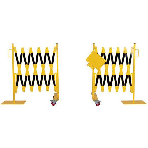 Set de barrières extensibles permettant de bloquer et de sécuriser de manière temporaire l'accès aux surfaces larges. L'élément de fixation central permet de relier les 2 barrières entre-elles mais aussi d'afficher une note d'information format A4. Solides et stables: barrières sur roulettes avec freins pour une utilisation simple et sûre. Revêtu par poudre. Certificat du TÜV. Manipulation facile grâce à ses poignets.