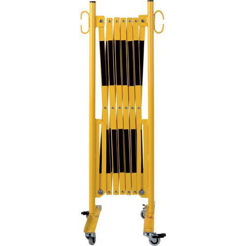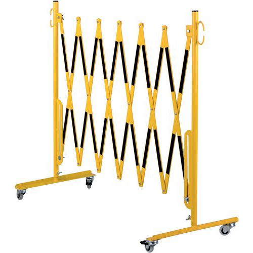Barrière extensible en acier sur roulettes et fixation murale pour une délimitation temporaire. Bandes bi-colores pour plus de visibilité. Convient uniquement pour une utilisation intérieur. Facile à manipuler, stocker et utiliser grâce à ses roulettes avec frein. Certificat du TÜV.