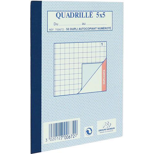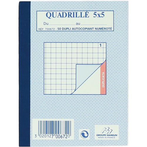 | Intitulé du produit | Bloc-notes quadrillé 5/5 dupli A6 100 pages, Réglure: Aucune, Nb de pages: 100, Type de reliure: Souple |