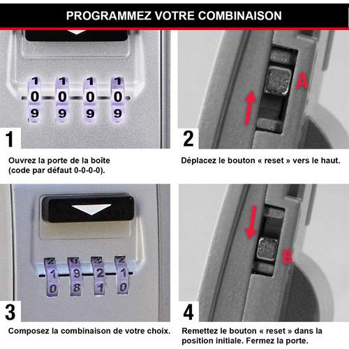 - Combinaison programmable à 4 chiffres avec larges molettes (jusqu'à 10 000 codes disponibles).