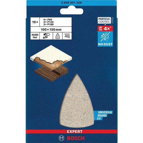 Boîte d'abrasifs réticulés M480 - Bosch Extraction de la poussière jusqu'à 4 fois supérieure à celle des feuilles abrasives standard Évacuation de la poussière particulièrement efficace avec Bosch Particle Control. Se met simplement en place par fixation auto-agrippante. Idéal pour un ponçage sans poussière très efficace des surfaces planes, pour des travaux de dégrossissage et préparation des surfaces à peindre, et pour des travaux de préparation ou de finition des cloisons sèches. Idéal pour les rénovateurs : propre et efficace.