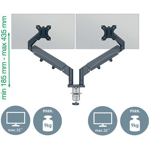 | Intitulé du produit | Bras double pour écran, Charge maxi: 9 kg, Coloris: Gris foncé, Hauteur mini: 185 mm, Hauteur maxi: 435 mm |