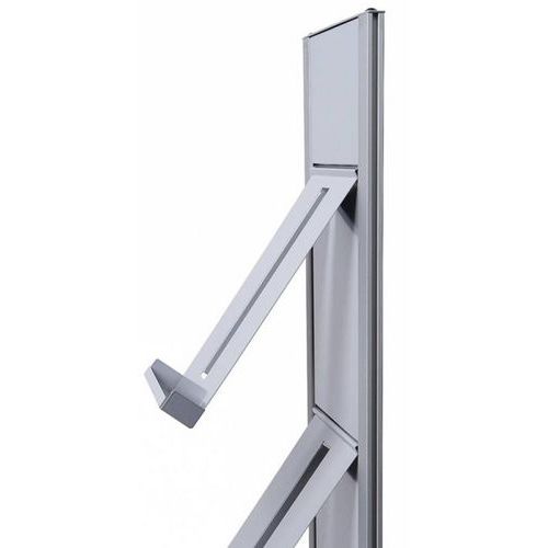 Facile à monter: 4 étagères en métal ou pochettes facilement insérables en styrène transparent permettant d‘afficher la page de garde des brochures A4.