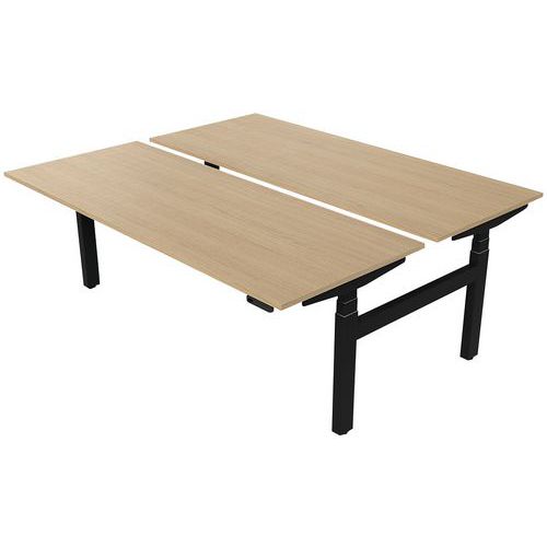 Bureau double en bench pour optimiser l'échange de vos collaborateurs. Séparé d'un espace vous permettant de faire passer des câbles, le bureau est réglable en hauteur grace à un système électrique placé sur le côté droit du bureau. Pieds en H.