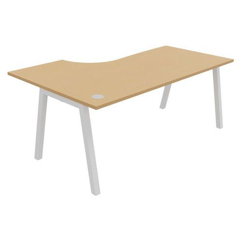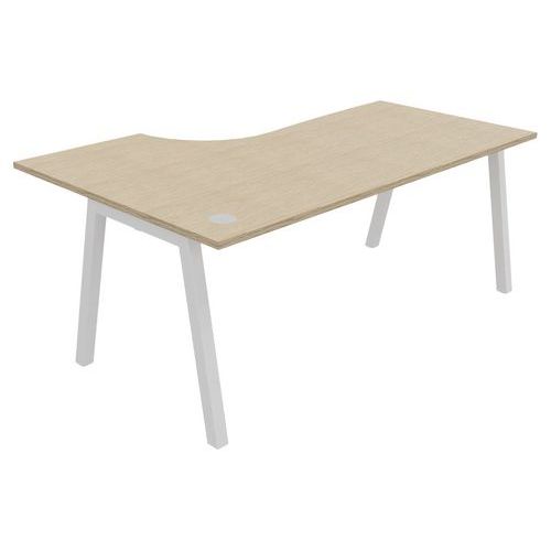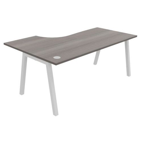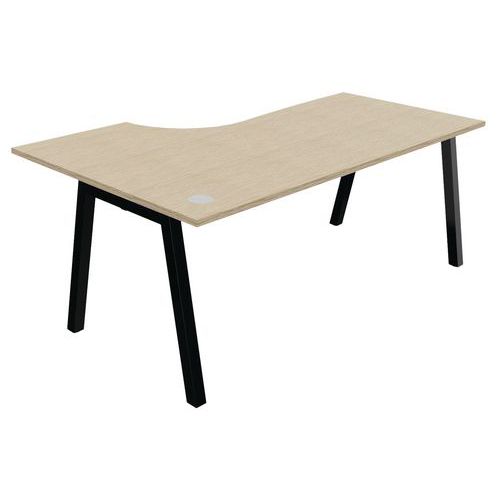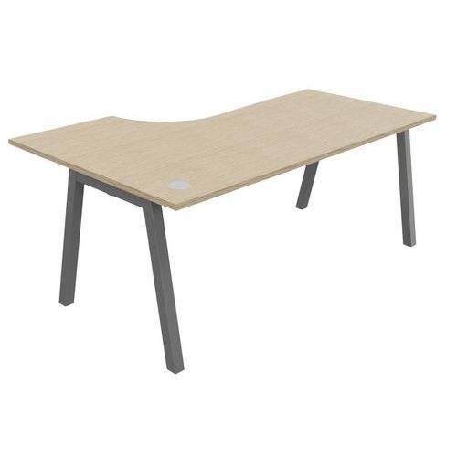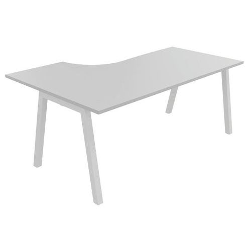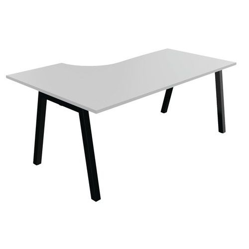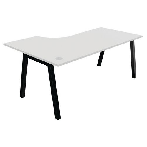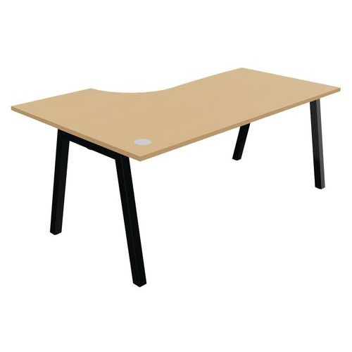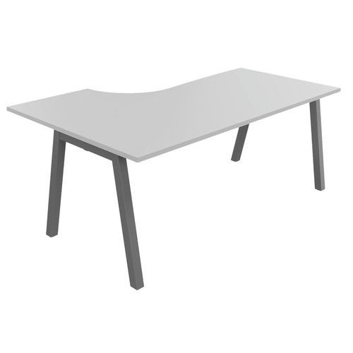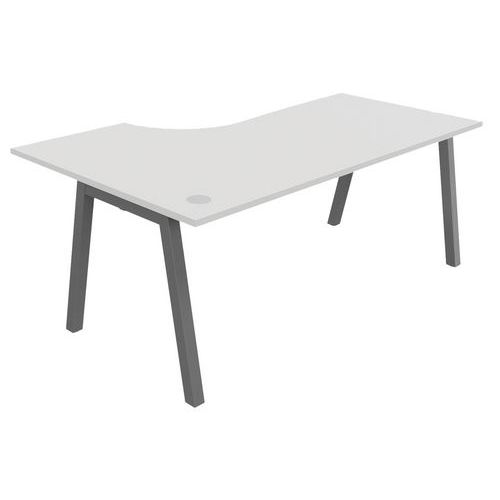 Plateau mélaminé ép. 25 mm équipé d'un obturateur passe-câble Chant ABS antichoc 2 mm Piétement métallique en arche composé de pieds carrés de section 50 x 50 mm obliques, finition époxy laqué. Vérins de stabilisation pour compenser les défauts de planéité du sol (course de réglage 10 mm)