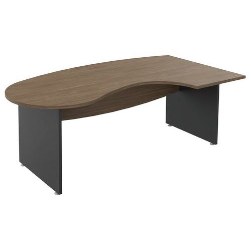 Grand espace de travail : avec d'un côté une convivialité arrondie pour travailler avec les visiteurs et de l'autre un retour de plateau profondeur 120 cm à équiper d'un pied de renfort ou d'un caisson hauteur bureau profondeur 60 cm.