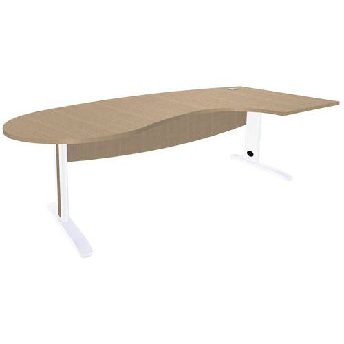 Bureau convivial piètement L métal Quatuor avec retour à droite ou à gauche Plateau panneau de particules hauteur 72 cm. Pieds métal forme L avec passage de câbles sous baguettes bois amovibles. Piètement équipé de vérins de réglage d'aplomb. Retour de plateau profondeur 110 cm (120 cm hors tout) à compléter d'1 pied de renfort ou d'1 caisson hauteur bureau. L/l/P hors tout plateau : 200 x 120 x 60 cm. Livré prêt à monter avec notice.