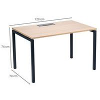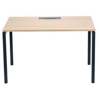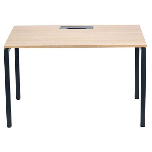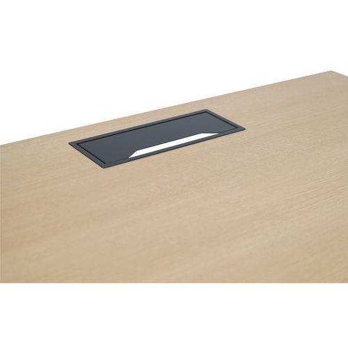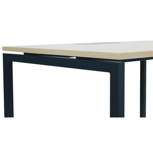 Bureau droit avec plateau mélaminé 25mm et chants en ABS de 2mm. 2 traverses de maintien en tube métallique de 40x20mm. Structure des pieds droit en métal 40x40mm avec pieds en plastique pour le nivellement. Plateau muni d'un passage de câble avec trappe pour aider à la gestion des câbles.