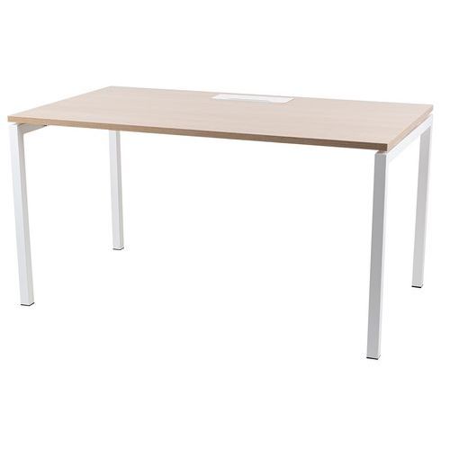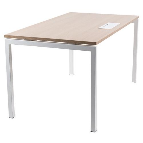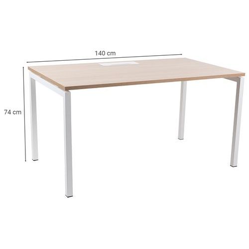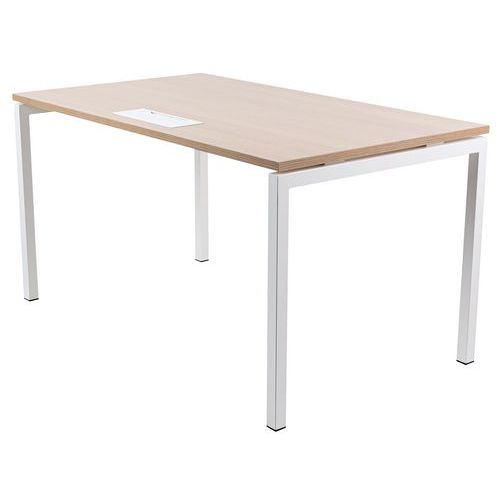 Bureau droit avec plateau mélaminé 25mm et chants en ABS de 2mm. 2 traverses de maintien en tube métallique de 40x20mm. Structure des pieds droit en métal 40x40mm avec pieds en plastique pour le nivellement. Plateau muni d'un passage de câble avec trappe pour aider à la gestion des câbles.