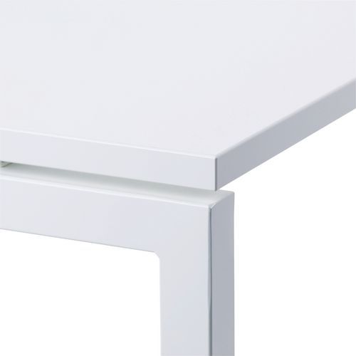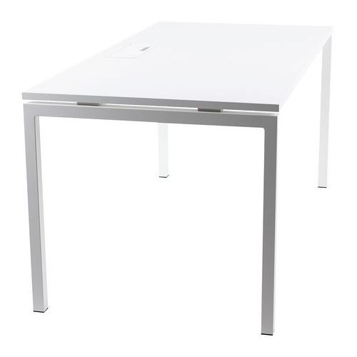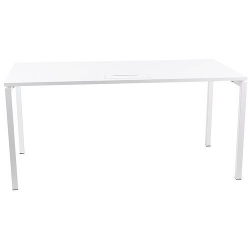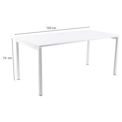 Bureau droit avec plateau mélaminé 25mm et chants en ABS de 2mm. 2 traverses de maintien en tube métallique de 40x20mm. Structure des pieds droit en métal 40x40mm avec pieds en plastique pour le nivellement. Plateau muni d'un passage de câble avec trappe pour aider à la gestion des câbles.