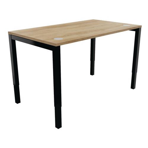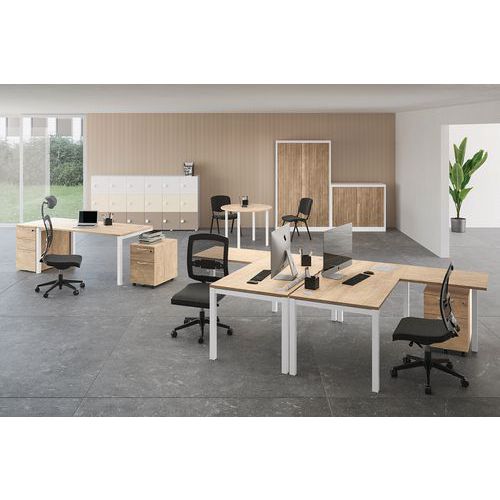 Bureau droit Astro Arche avec piétement en métal pour plus de solidité Plateau mélaminé Structurex® épaisseur 25 mm Chants ABS anti choc 2 mm Plateau équipé d'obturateurs Ø 80 mm pour le passage de câbles Piétement structure métal composé de pieds de section carrée 50 mm et d’une platine supérieure en retrait, l'ensemble relié par une poutre centrale en acier finition époxy laqué. Piétements arche réglable en hauteur de 64 cm à 86 cm pour les postes individuels. Vérins de stabilité pour compenser les défauts de planéité du sol. En configuration face à face, un espacement de 3 cm entre les plateaux permet le positionnement d’un écran séparateur ou le passage des câbles. Livré prêt à monter avec notice.