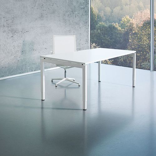 Bureau droit avec piètement en U. Manivelle de réglage pour ajuster votre bureau en hauteur. La manivelle de réglage est rangée sous la table et se place sur le piétement pour monter ou descendre le bureau.