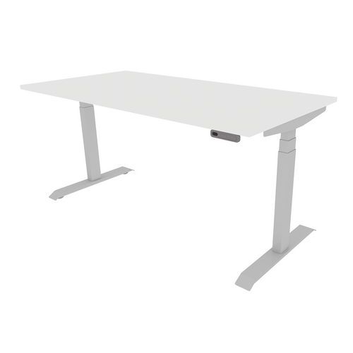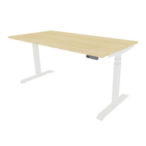 La table assis-debout de Venta T est réglable en hauteur par un clavier (65 – 130 cm). Le clavier est installé de série sur le côté droit de votre table haute. Système à clavier (flèche haut/flèche bas), avec 3 positions en mémoire. La table est munie d’un châssis soudé avec des poutres télescopiques, 2 supports de plateau, 2 piétements en T et 1 plateau. Sur la structure solide est fixée une tablette en aggloméré mélaminé de 25 mm. Toutes les parties sont arrondies d’un rayon pour éviter que l’utilisateur ne se blesse. Compatible avec la gamme de bureau Venta.