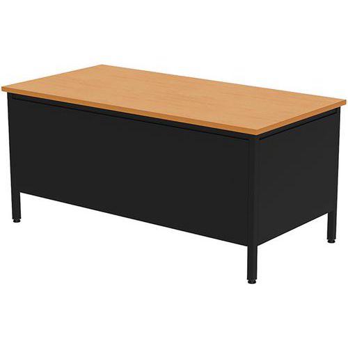 Bureau ministre Confort 2 avec caisson. Piètements en tubes carrés de 35x35x2 mm avec renfort en métal dans les coins. Piètements sur vérins réglables en synthétique. Structure métallique solide en tôle de 1.5 mm. Les parties métalliques sont peintes en poudre époxy-polyester. Hauteur bureau fixe: standard à 75 cm (incl. top de 25 mm).