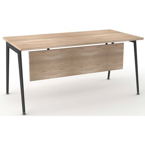Plan de travail en aggloméré en ép. 25 mm, revêtu sur deux cotés avec papier décoratif impégné de résine anti-rayures, antireflet et lavable. Chants droits en ABS en 2 mm antichoc sur le 4 cotés assortis au plan. Dénsité panneau: 670/730 kg/m3. Pieds et poutre en tôle d’acier verni avec poudre époxy.