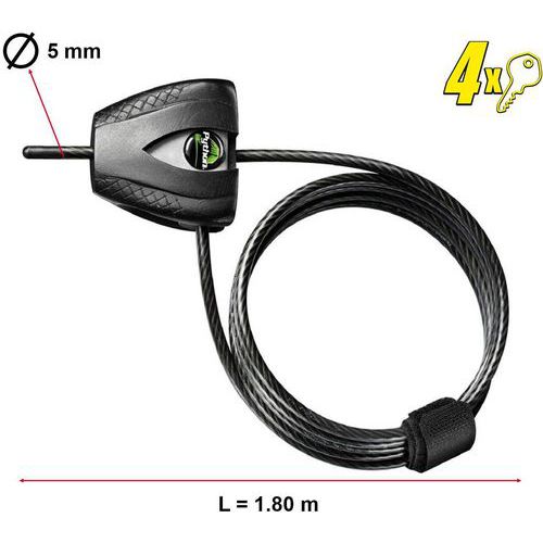 | Intitulé du produit | Câble antivol avec python ajustable, Ø: 5 mm, Longueur: 1800 mm, Nb de clés: 2, Poids du produit: 0.214 kg |