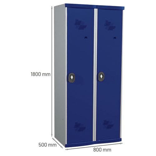 Vestiaire en tôle d'acier 1er choix, de belle rigidité, indéformable. Tôle d'acier 6/1e profilée (équivaut à pliage standard 8/1e). Colonnes soudées entre elles pour une plus grande solidité. Double penderie séparée pour vêtements propres et sales. Excellente résistance mécanique avec profil fermé agrafé. Porte indégondable ouverte ou fermée, antieffraction. Articulation sur charnières avec ouverture à 18°. Armoire vestiaire avec porte-étiquette embouti.