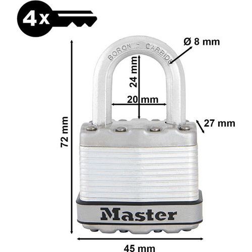 Cadenas à clé en acier laminé, Coloris: Argent, Longueurs: 40 mm, Nb de clés: 4, Anse Ø: 8 mm