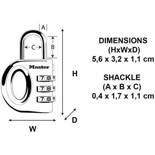| Intitulé du produit | Cadenas à combinaison multicolor 633EURD, Anse Ø: 4 mm, Nb de molettes: 3, Longueur: 56 mm, Hauteur: 2.1 cm |
