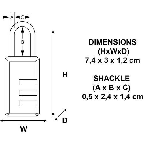 | Intitulé du produit | Cadenas à combinaison programmable, Anse Ø: 5 mm, Nb de molettes: 3, Longueur: 74 mm, Hauteur: 2.9 cm |
