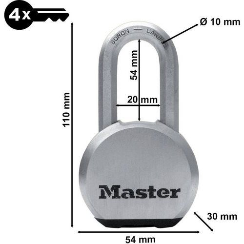 | Intitulé du produit | Cadenas haute sécurité clé acier inoxydable anse longue, Longueurs: 109 mm, Nb de clés: 4, Anse Ø: 10 mm |