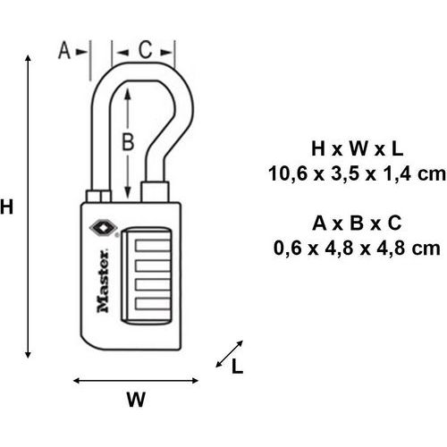 | Intitulé du produit | Cadenas pour bagages à combinaison programmable 4696EUR, Anse Ø: 6 mm, Nb de molettes: 4, Longueur: 106 mm |