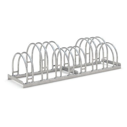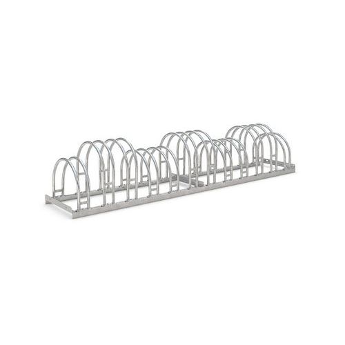 Conception robuste en acier protégé contre la corrosion avec des arceaux de stationnement en forme d'arc. Offre beaucoup de place dans un espace limité. S’utilise partout où les vélos doivent être garés rapidement : devant les magasins, les cabinets, etc. Les ancrages au sol et les supports de montage sont vendus séparément.