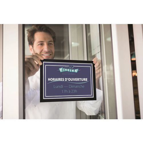 Cadre pour l'affichage de documents prix, horaires d’ouverture, promotions… Cadre d'affichage Duraframe® Sun, spécialement conçu pour les surfaces vitrées exposées au soleil. Grâce à sa fixation vitrostatique, le cadre peut se fixer sur des vitrines, fenêtres, vitres etc. Insertion et actualisation rapide de l'affiche grâce à l'encadrement magnétique. Résistant à la chaleur (jusqu'à 70°C) et possède un traité anti UV efficace jusqu'à 2 ans. Avec film antireflet. Couleur du cadre identique de chaque côté. S'utilise au format portrait ou paysage. Conçu pour l'affichage d'information et de publicité.