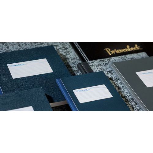 Réglure lignée bleue (seule la référence 2104265600 a des carreaux). Reliure encollée en toile de lin. Couverture et dos en carton rigide. Étiquette sur la couverture. En papier 70 et 80 g/m², sans bois.