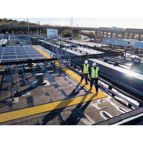 Caillebotis PVC flexible gris pour chemins techniques sur toits plats, portiques routiers et hautes passerelles. Revêtement de sol avec surface pointe de diamant certifiée antidérapante, libre à poser, sans fixation. Matériau non poreux, résistant aux produits chimiques, UV et conditions météorologiques extrêmes. Construction durable à 2 couches croisées, grille ouverte favorisant le bon drainage des liquides. Structure inférieure souple: parfaite adhérence au sol et protection maximale des supports. Structure supérieure: barres transversales pour prise ferme mais confortable sous le pied.