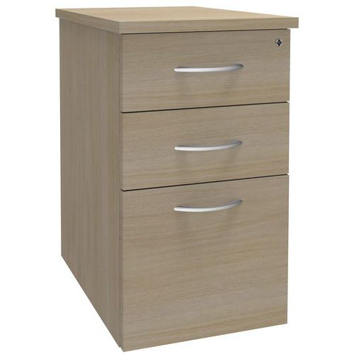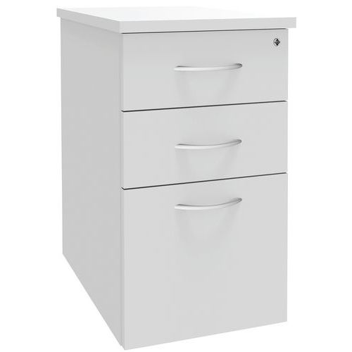 Top de finition épaisseur 25 mm 2 tiroirs + 1 tiroir pour dossiers suspendus. Plumier amovible dans tiroir haut. Tiroirs métal à ouverture sélective. L/H/P : 43 x 72 cm. Fabriqué en France. Vérins de réglage d'aplomb. Livré monté avec pièces de liaison pour extension des bureaux asymétriques.