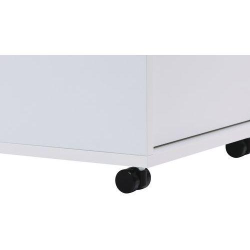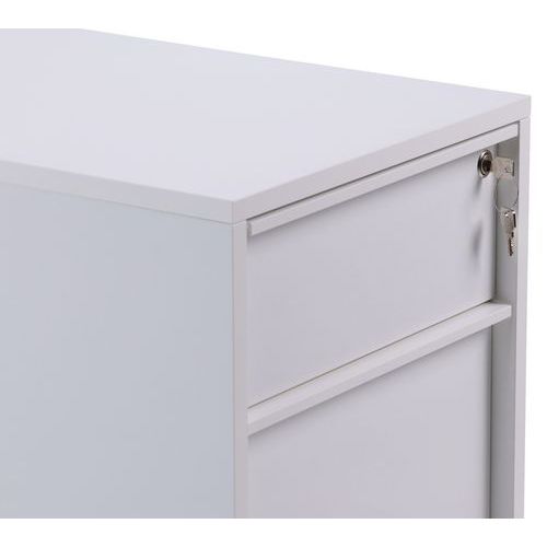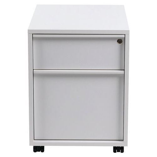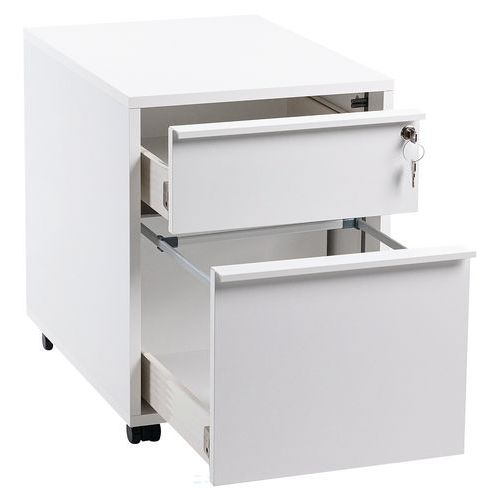 Caisson mobile Misao en mélaminé avec chants 1 mm. 2 tiroirs en panneau mélaminé dont un pour dossier suspendu. Les hauteurs utiles des tiroirs sont de 14.5 cm et 27.7 cm, pour une largeur utile de 32.5 cm. Tiroir dossier suspendu convient au dossiers A4 et foolscap. Verrouillage central sans anti bascule. Poignée fabriquée en profilé d'aluminium anodisé. Charge maximal pour chaque tiroir de 25kg. Roulettes pivotantes de 37 mm de diamètre.
