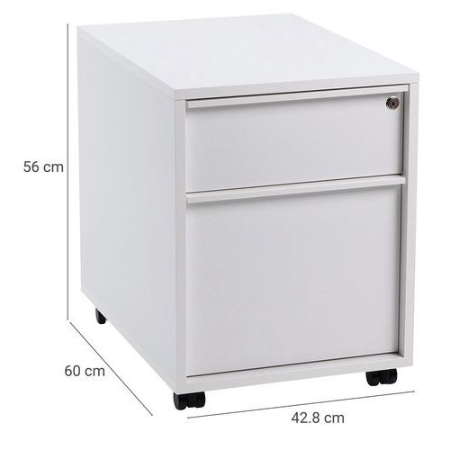 Caisson mobile Misao en mélaminé avec chants 1 mm. 2 tiroirs en panneau mélaminé dont un pour dossier suspendu. Les hauteurs utiles des tiroirs sont de 14.5 cm et 27.7 cm, pour une largeur utile de 32.5 cm. Tiroir dossier suspendu convient au dossiers A4 et foolscap. Verrouillage central sans anti bascule. Poignée fabriquée en profilé d'aluminium anodisé. Charge maximal pour chaque tiroir de 25kg. Roulettes pivotantes de 37 mm de diamètre. Fabriqué en UE Garantie client : 10 ans