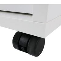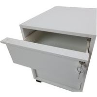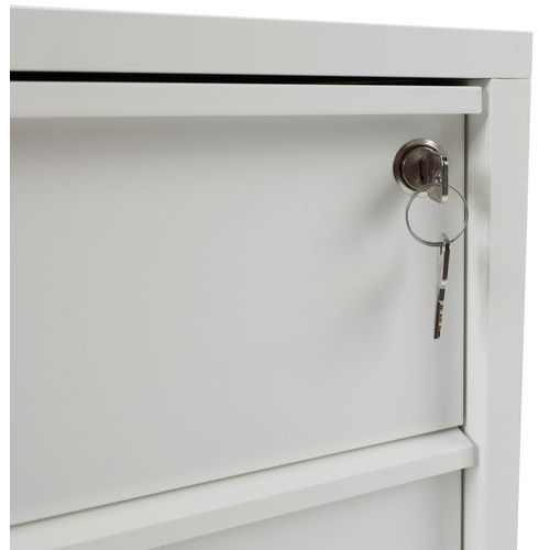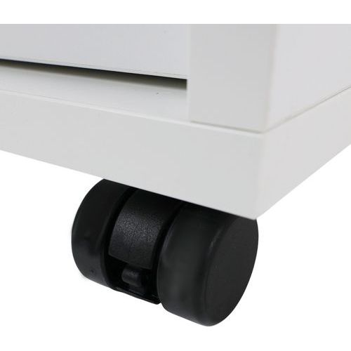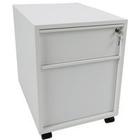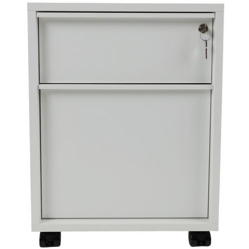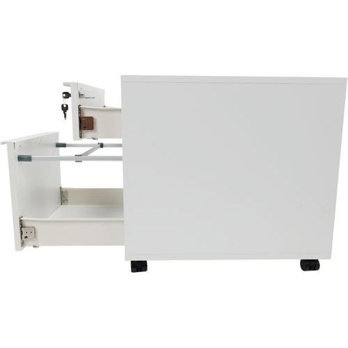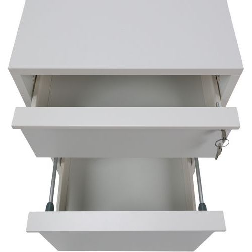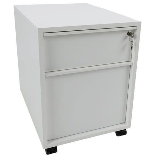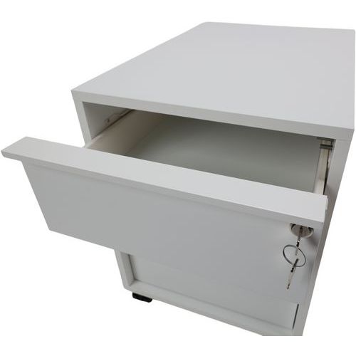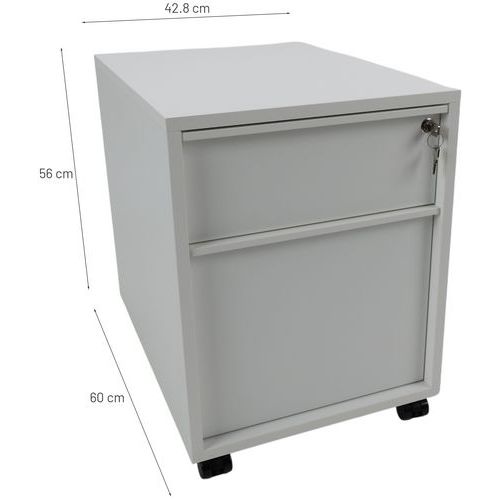 Caisson mobile Misao en mélaminé avec chants 1 mm. 2 tiroirs en panneau mélaminé dont un pour dossier suspendu. Les hauteurs utiles des tiroirs sont de 14.5 cm et 27.7 cm, pour une largeur utile de 32.5 cm. Tiroir dossier suspendu convient au dossiers A4 et foolscap. Verrouillage central sans anti bascule. Poignée fabriquée en profilé d'aluminium anodisé. Charge maximal pour chaque tiroir de 25kg. Roulettes pivotantes de 37 mm de diamètre.
