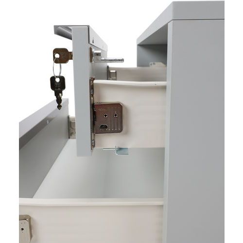 Caisson mobile Misao en mélaminé avec chants 1 mm. 3 tiroirs en panneau mélaminé. Hauteur des tiroirs de 8,6 cm et une largeur de 50 cm. Verrouillage central sans anti bascule. Poignée fabriquée en profilé d'aluminium anodisé. Charge maximal pour chaque tiroir de 25kg. Roulettes pivotantes de 37 mm de diamètre.