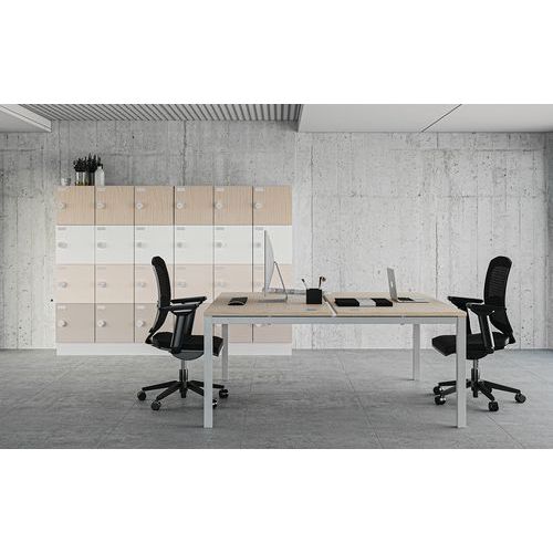 | Données techniques | Patins de réglage Ø 55 mm / H 2,5 cm pour compenser les défauts de planéité du sol (ou socle H 13,5 cm optionnel). Dimensions utiles d'1 case : P 42,5 x H 37 x L 37 cm. Portes standards (H 38 x L 38 cm) ou avec fente courrier (H 35,5 x L 38 cm), en panneau mélaminé Structurex®ép. 16 mm, munies d'une poignée serrure à code et d'un amortisseur de fermeture. |