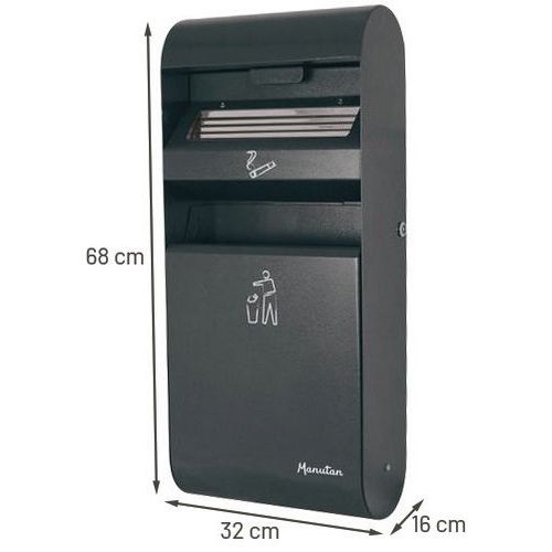 | Intitulé du produit | Cendrier-poubelle mural, Cendrier capacité: 3 L, Coloris: Gris foncé, Matériaux: Acier, Hauteur: 68 cm |