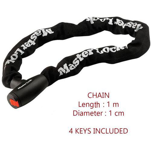 | Intitulé du produit | Chaîne antivol pour motos et scooters, Ø: 10 mm, Longueur: 1000 mm, Nb de clés: 4, Poids du produit: 2.195 kg |