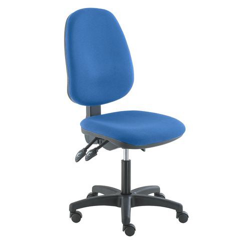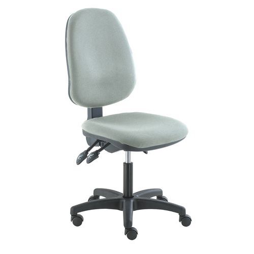Chaise de bureau rembourrée avec un mécanisme asynchrone à trois leviers, qui permet un réglage en douceur de l'angle du dossier et de l'assise et leur verrouillage dans n'importe quelle position. La chaise est équipée d'un support lombaire surélevé et d'un dossier de forme ergonomique réglable en hauteur. La hauteur du siège peut être réglée avec un piston à gaz.