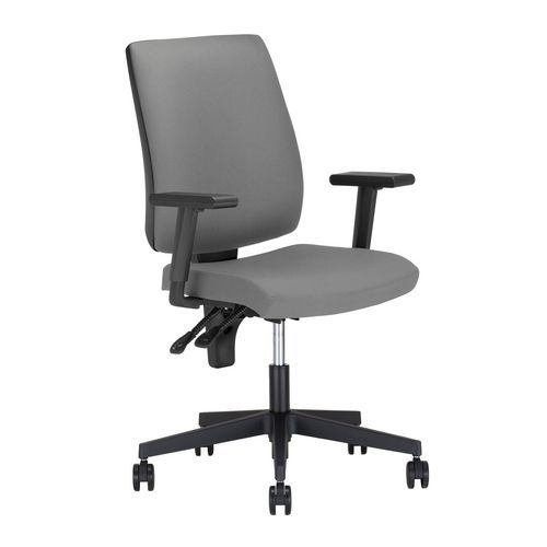 Chaises de bureau rembourrées avec un dossier confortable de forme ergonomique et la possibilité de régler l'inclinaison du dossier. Le mécanisme de dossier assure un contact permanent du dossier avec le dos de l'utilisateur. Les chaises de bureau sont équipées d'une croix noire à cinq bras avec roulettes conçues pour les revêtements de sol souples.