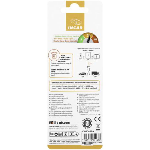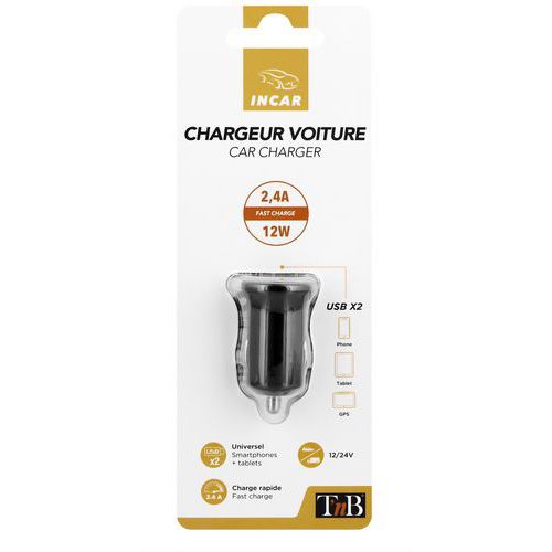 | Intitulé du produit | Chargeur allume-cigares double USB 2.4A, Coloris: Noir, Emballage recyclable: Oui - 100 % |