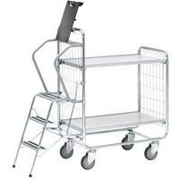 Chariot à échelle avec 2 plateaux, stable à utiliser pour la préparation de commandes dans l'entrepôt.