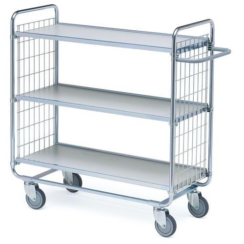 Chariots à étagères de fabrication suédoise en acier galvanisé brillant - parfaits comme chariots de préparation de commandes dans un entrepôt ou un magasin.